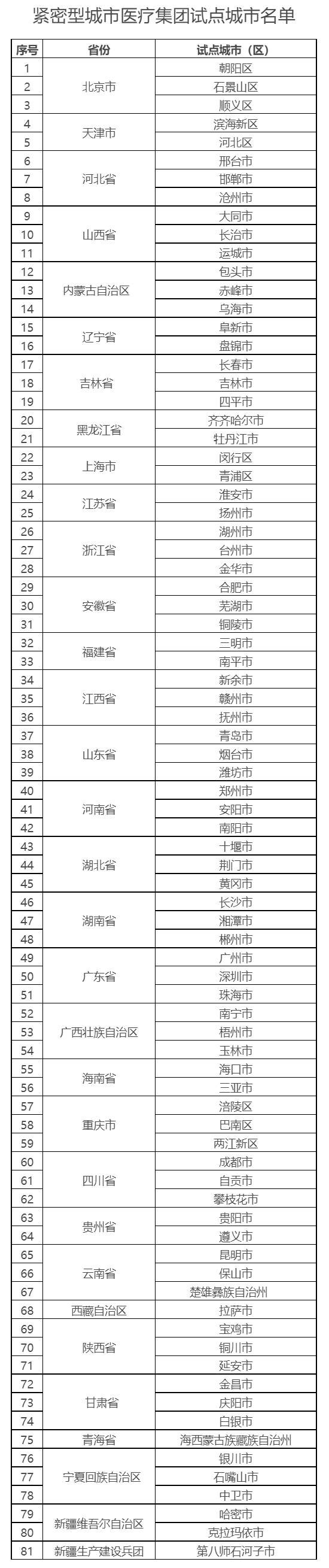 根据《关于开展紧密型城市医疗集团建设试点工作的通知》(国卫医政函〔2023〕27号)要求,在各地推荐的基础上,国家卫生健康委、国家发展改革委、财政部、人力资源社会保障部、国家中医药局和国家疾控局确定了81个紧密型城市医疗集团建设试点城市(地级市和直辖市的区)。现将名单印发给你们,请认真组织实施试点工作,不断总结试点经验,研究解决试点过程遇到的问题,确保试点取得实效。