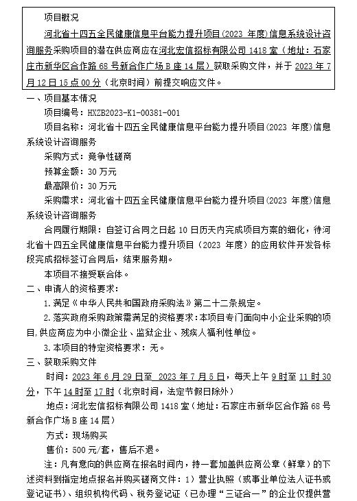 河北省十四五全民健康信息平台能力提升项目(2023年度)信息系统设计咨询服务竞争性磋商公告