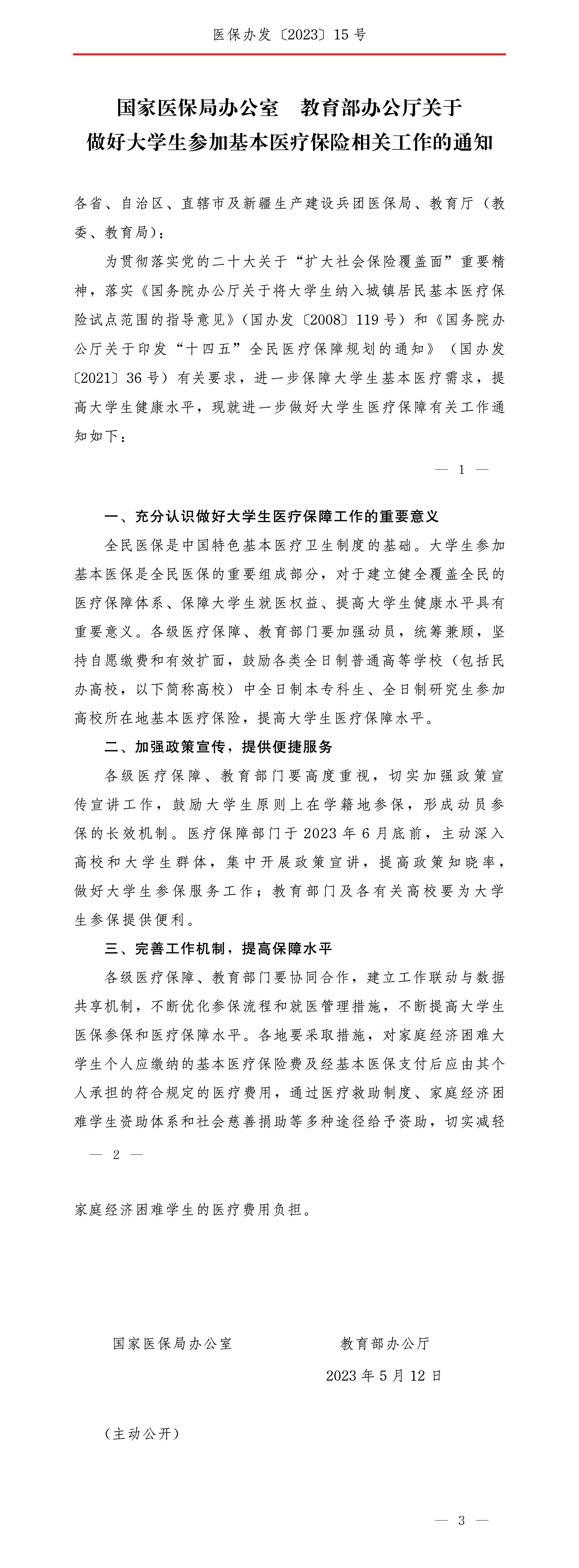 国家医保局办公室 教育部办公厅关于做好大学生参加基本医疗保险相关工作的通知