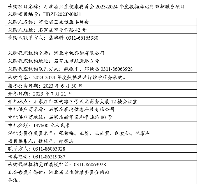 河北省卫生健康委员会2023-2024年度数据库运行维护服务项目公开招标中标公告
