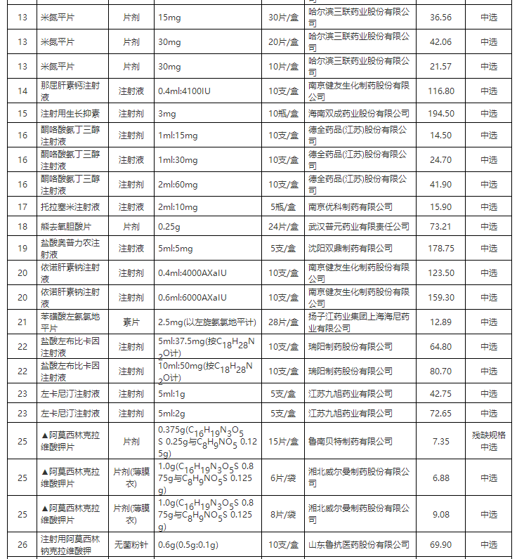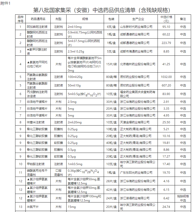 附件:1.第八批国家集采(安徽)中选药品供应清单(含残缺规格)