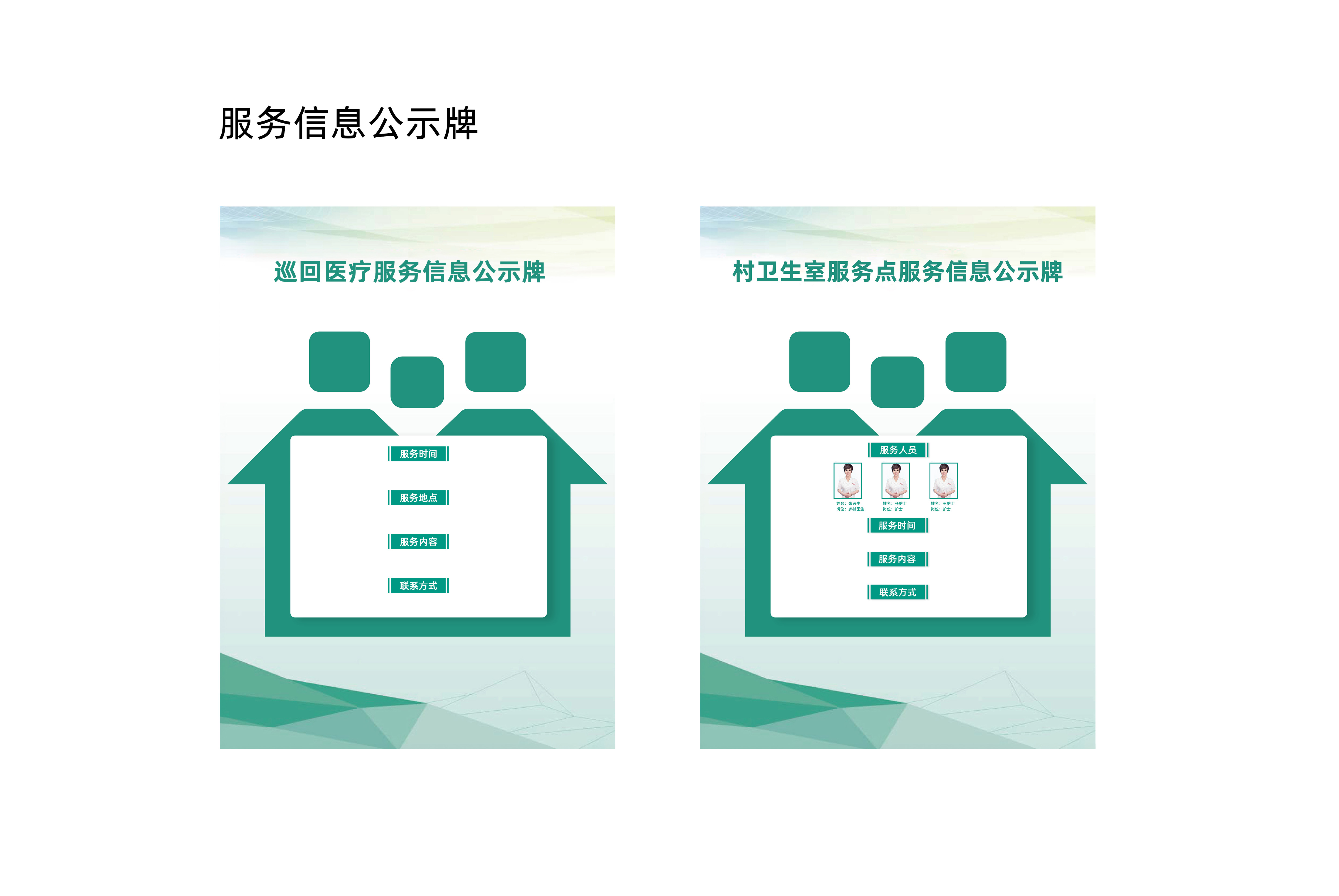 (5)服务时间。原则上每周巡诊至少2次,每次至少半天,对服务需求较小地区可适当调整频次。村卫生室服务点服务人员、服务时间、服务内容、联系方式要在村内显著位置及村卫生室服务点公布。