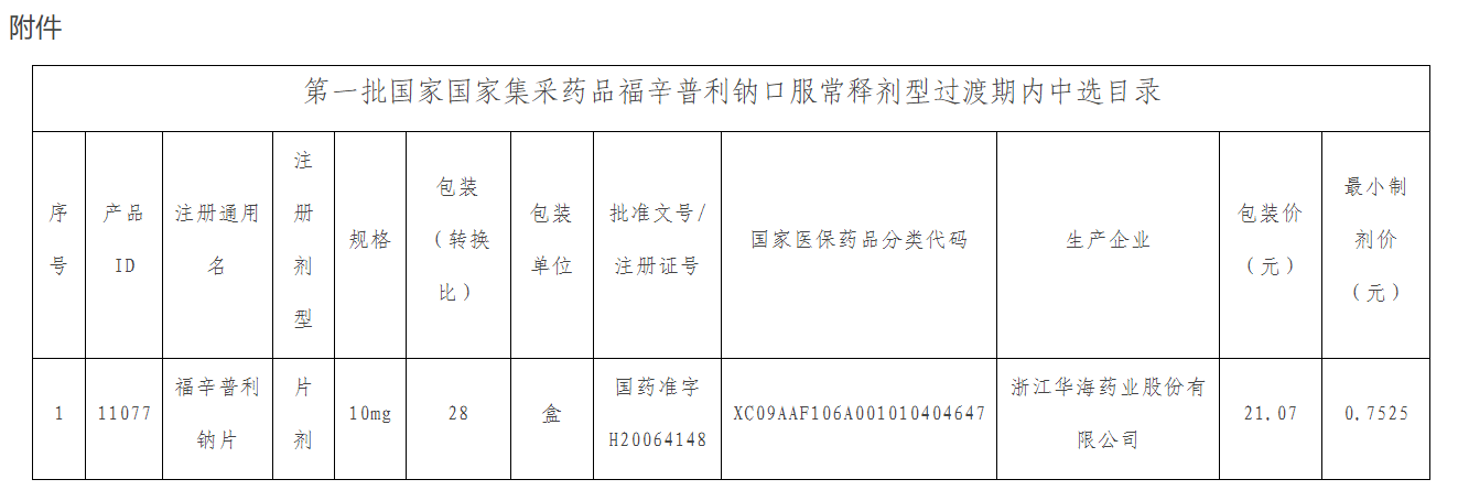 附件:第一批国家国家集采药品福辛普利钠口服常释剂型过渡期内中选目录