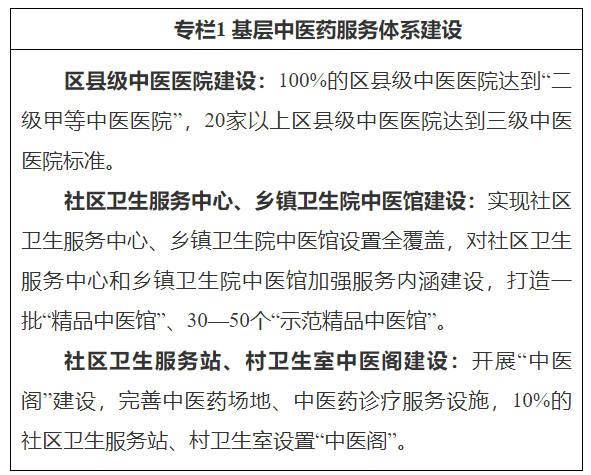 ——基层中医药服务提供基本实现全覆盖,100%社区卫生服务中心、乡镇卫生院能够规范开展10项以上中医药适宜技术,100%社区卫生服务站、80%村卫生室能够规范开展6项以上中医药适宜技术;