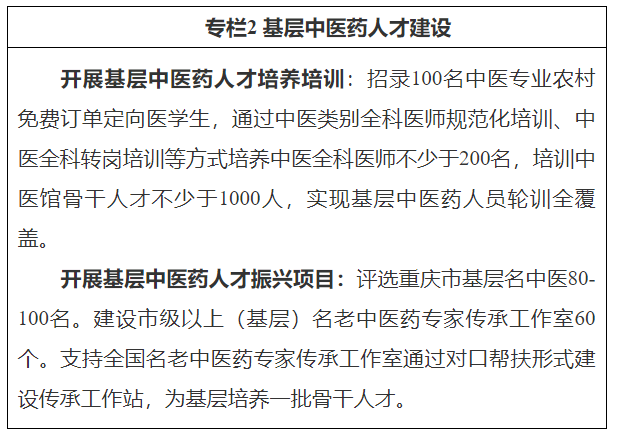 5.扩大基层中医药人才有效供给。实施“巴渝岐黄工程”,推进“优才、薪火、青苗、春雨”人才培养计划,依托中医适宜技术培训推广基地开展基层中医药知识和技能培训,实现基层中医药人员轮训全覆盖。每个二级以上区县级中医医院建立1—2个传承工作室,培养基层中医药人才。根据需求合理确定本科层次中医专业农村订单定向免费医学生培养规模,持续开展中医类别全科医生规范化培训、助理全科医生培训、转岗培训等,为基层培养中医药人才。对现有基层中医药人员通过岗位培训、外出进修、跟师学习等方式,提高岗位技能和服务能力。鼓励退休中医医师和中医医术确有专长医师到基层执业服务。
