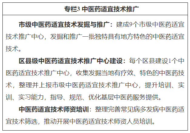 8.加强中医药适宜技术推广平台建设。完善市级中医药适宜技术推广中心设置,提升原区县级常见病多发病中医药适宜技术推广基地能力,建成区县域中医药适宜技术推广中心,市、区县两级中心应具备符合规范要求的师资、设施、设备,设置有符合标准的适宜技术示教和实训场地,具备远程培训示教能力。全面完善适宜技术推广工作机制,各中心要落实适宜技术推广责任制,按要求配置适宜技术推广人员,负责区县域、乡镇、村级卫生机构适宜技术推广,做到人员相对固定。到2025年,建成9所市级中医药适宜技术推广中心,所有区县域均应设置符合标准的中医药适宜技术推广中心。