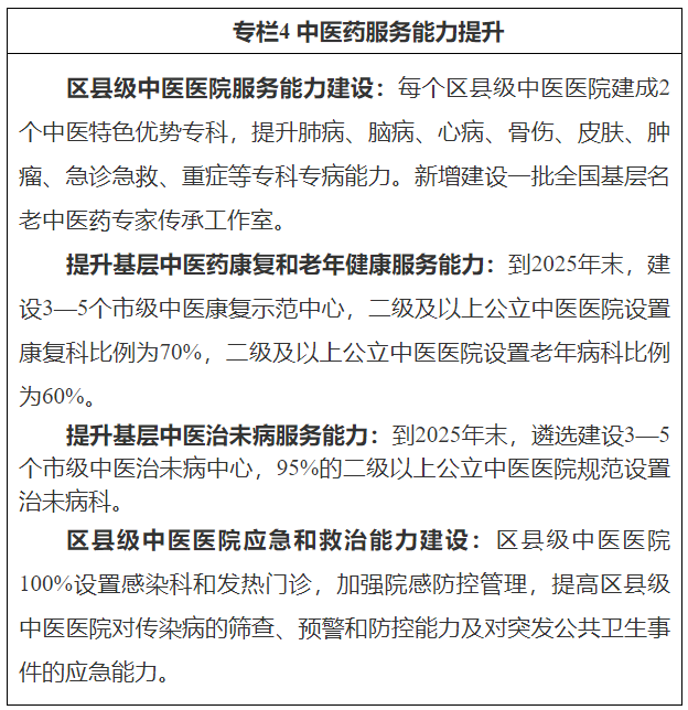 10.加强区县级医疗机构中医医疗服务能力建设。开展区县级中医医院“两专科一中心”建设,即每个区县级中医医院建成2个中医特色优势专科和1个区县域中医药适宜技术推广中心。加强区县级中医医院临床薄弱专科、医技科室建设,提高医院综合服务能力。加强基层名老中医药专家传承工作室建设,培养基层中医药人才。提升区县中医医院传染病防治能力,实现区县级中医医院感染科和发热门诊设置全覆盖,加强院感防控管理,提高区县级中医医院对传染病的筛查、预警和防控能力及对突发公共卫生事件的应急能力。加强区县级中医医院基层指导科建设,负责全区县中医药技术指导和业务培训。推进中西医协同诊疗服务,提升区县综合医院、妇幼保健机构中医药综合服务能力和专科诊疗能力。到2025年底,全部区县公立中医医院达到《县级中医医院医疗服务能力基本标准》。