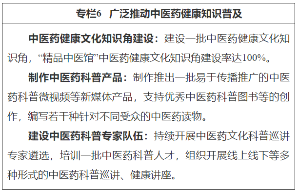 17.普及中医药健康知识。所有区县依托区县级医院建设中医药文化宣传教育基地,将中医药科普知识和《中国公民中医养生保健素养》作为健康教育重要内容加以推广。充分利用网络化、智能化、数字化等方式,扩大中医药优质科普内容的覆盖面。推动区县在社区卫生服务中心、乡镇卫生院、社区居委会、乡村群众活动场所等建设中医药健康文化知识角。鼓励基层医疗机构通过电子屏、海报、宣传栏等经常性展示科普内容,开展健康讲座等科普活动。加强中医药科普专家队伍建设,鼓励中医药医务人员、科研人员面向社会开展科普服务。支持优秀中医药科普作品、文化产品、新媒体产品等创作。