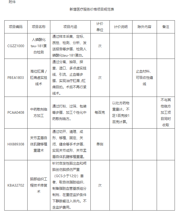 附件:新增医疗服务价格项目规范表