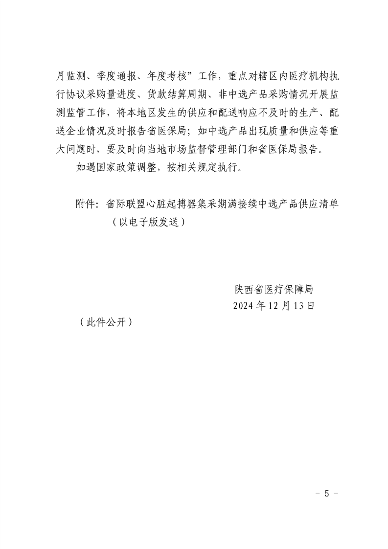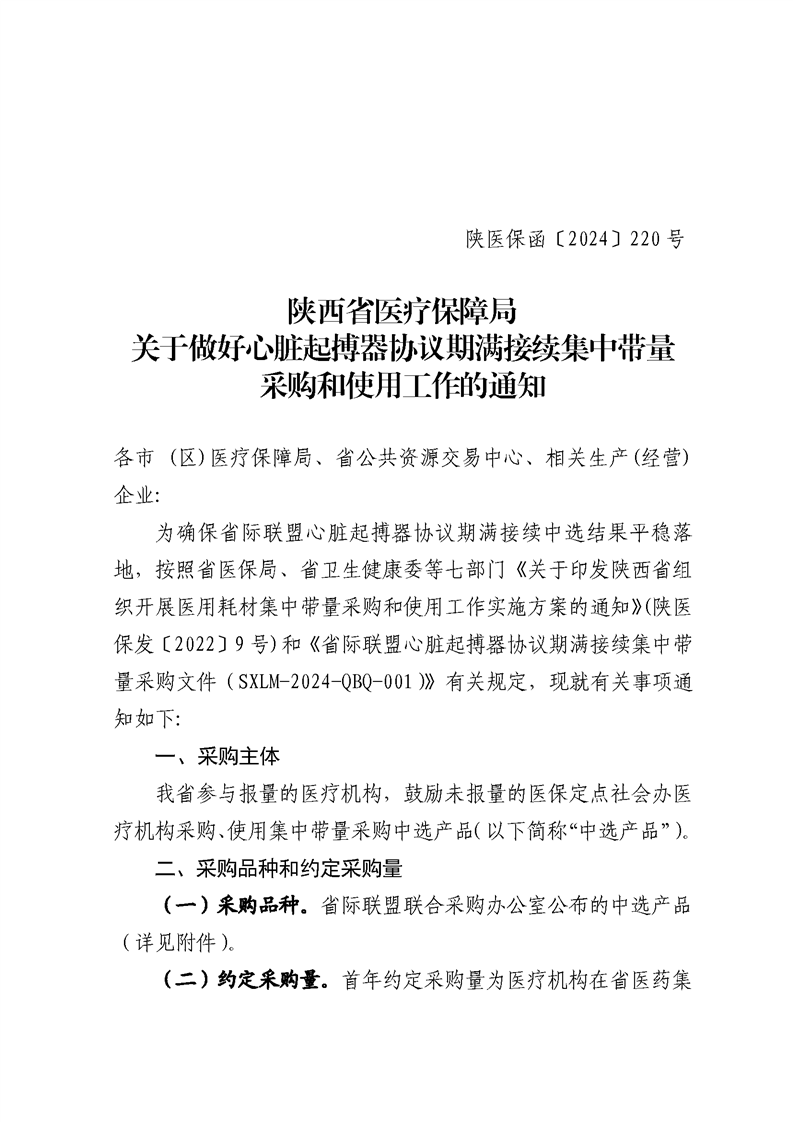 陕西省医疗保障局关于做好心脏起搏器协议期满接续集中带量采购和使用工作的通知