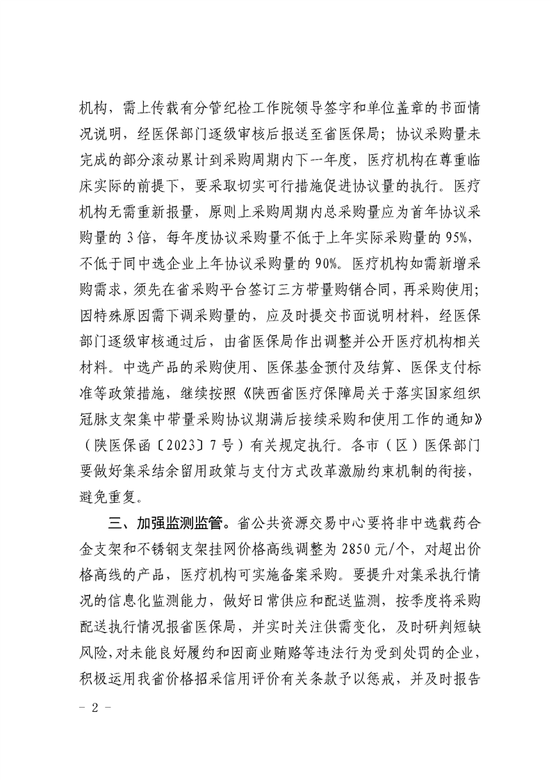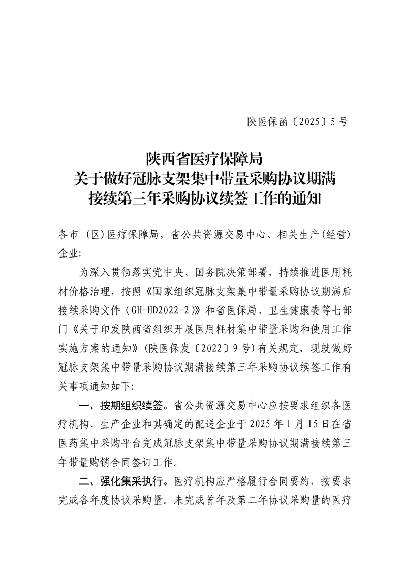 陕西省医疗保障局关于做好冠脉支架集中带量采购协议期满接续第三年采购协议续签工作的通知