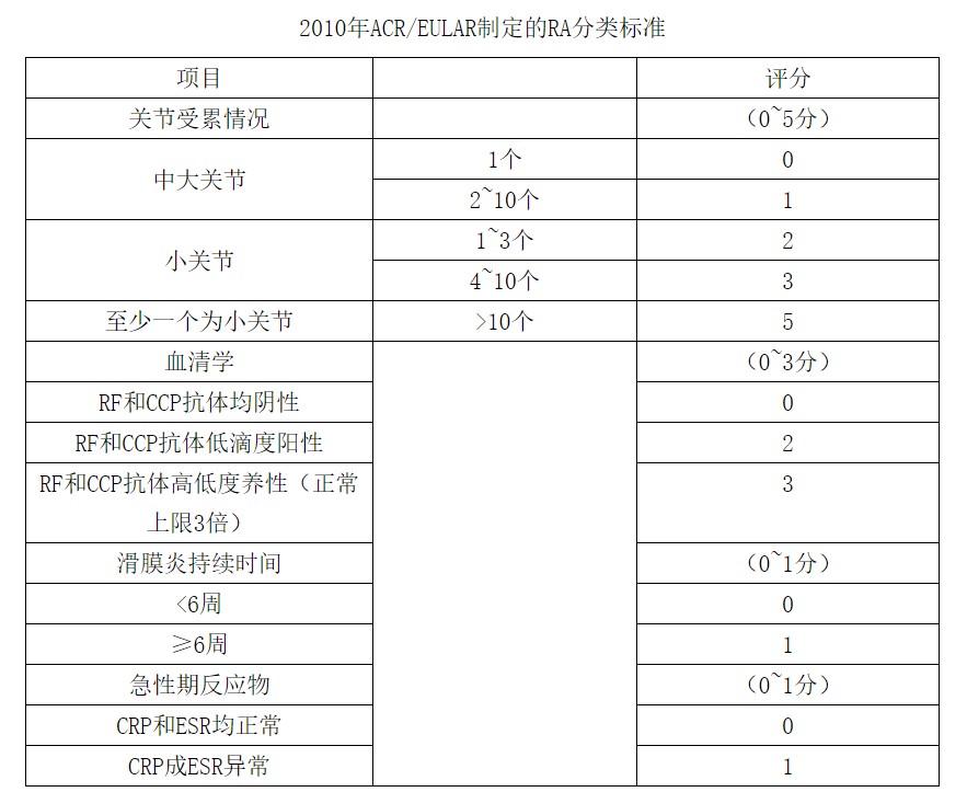 (一)符合2010年ACR/EULAR制定的RA分类标准