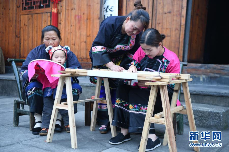 施林娇(右一)在十八洞村学习苗绣(2020年4月25日摄)。新华社记者 薛宇舸 摄