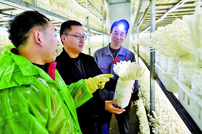 福建宁德古田县积极打造特色扶贫种植、养殖基地,助力农户增收致富。图为古田县晟农食用菌农民专业合作社工作人员和帮扶干部一起查看食用菌长势。新华社发