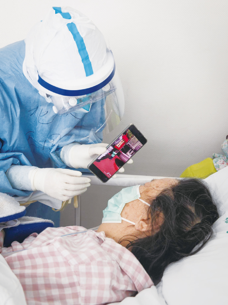 2020年3月23日,华中科技大学同济医学院附属同济医院中法新城院区,北京大学第一医院援鄂抗疫医疗队“90后”护士王周圳在帮助患者用手机与家人视频通话。 中国人口报记者 潘松刚/摄