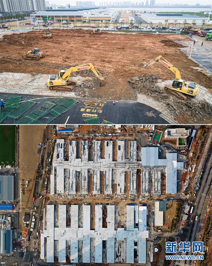 拼版照片:上图是1月26日拍摄的武汉雷神山医院建设工地(无人机照片,新华社记者肖艺九摄);下图是2月5日拍摄的武汉雷神山医院建设工地(无人机照片,新华社记者李贺摄)。经过十昼夜的奋战,2月6日,雷神山医院正式通过武汉市城建和卫健部门的验收,并开始逐步移交。 新华社发