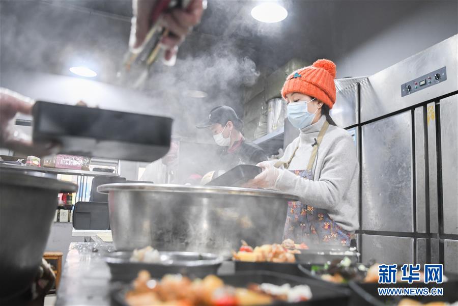 2月26日,爱心人士“雨衣妹妹”(右)在分装盒饭。 新华社记者 程敏 摄 (四)