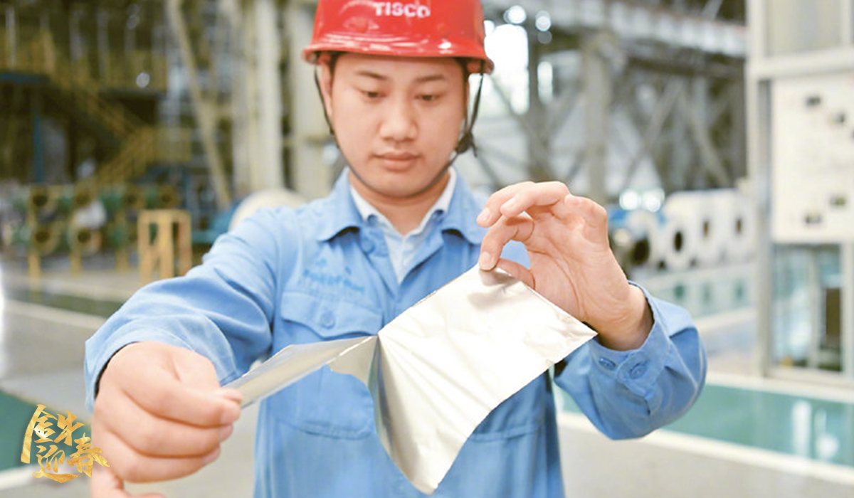 △太钢不锈钢精密带钢有限公司员工在展示用手撕开0.02毫米厚的宽幅软态不锈钢精密箔材。