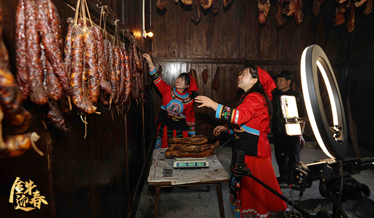 △2021年1月15日,电商服务志愿者通过直播的方式帮助偏远山村群众推介销售腊肉、香肠等特色“年味”农产品。
